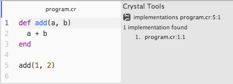 $ crystal tool implementations --cursor program.cr:5:1 program.cr