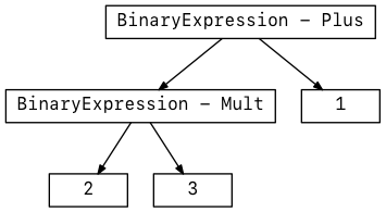 After the whole program was turned into a list of tokens, the parser turns them into an AST (Abstract Syntax Tree). The AST is a way of representing a program as a tree structure. Each node has a type and 0 or more children. The expression 1 + 2 * 3 would produce an AST which looks like this: